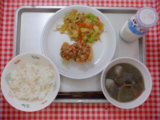 米(新潟)・しょうが(熊本)・にんじん(千葉)・えのきだけ(長野)・さやえんどう(鹿児島)・キャベツ(愛知)・もやし(栃木)・さといも(埼玉)・ごぼう(青森)・長ねぎ(群馬)・大根(日野市・福島幹男さん)・鶏肉(青森)