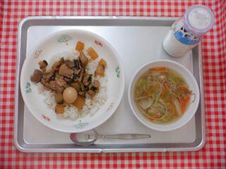 【ルーローハン】は台湾の料理で、豚肉と野菜を甘辛く煮て、ごはんにかけていただく料理です。八角という香辛料を使用するため、独特の香りが特徴ですが、給食では八角の代わりにシナモンを少しだけ加えています。大根やたけのこなどの野菜もたっぷり入れたルーローハンは、四小の人気メニューのひとつです。