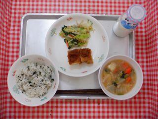 じゃことわかめのごはん・厚揚げのおろしだれ・野菜のアーモンド和え・冬野菜のみそ汁・牛乳