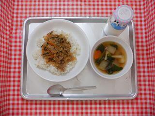 今日は午後に市内の先生が集まる会議があるため、配膳しやすく、パクパクと食べやすいメニューにしています。【プルコギ丼】は韓国料理のプルコギをのせた丼です。お肉と野菜、春雨などを甘めのしょうゆ味で味付けしているので、子供たちも食べやすく、人気メニューのひとつです。お肉もお野菜も摂れる丼メニューは、忙しい日でも栄養バランスが整いやすいので、ぜひご家庭でも作ってみてください。