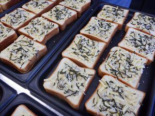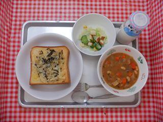 今日はカルシウムがたっぷり摂れる【骨活トースト】です。『骨活』とは、食事や運動によって骨の健康を保つ活動のことです。強い骨を作るためには、食事・運動・日光浴が大切といわれています。食事では、たんぱく質・カルシウム・ビタミンD・ビタミンKなどの摂取が骨の形成に関与しているため、必要量を摂ることが大切です。しかしながら、カルシウムの摂取量は、全年代において不足しているといわれています。給食では、成長期に必要なカルシウム量の半分を摂るように定められているため、毎日牛乳がついています。今日の【骨活トースト】は、骨の材料となるカルシウムとビタミンD、たんぱく質を多く摂取できます。チーズ・ちりめんじゃこ・刻みのりをのせた、のりの香りが香ばしいトーストが焼き上がりました。おいしく『骨活』しましょう♪