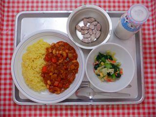 【チリビーンズライス】は大豆・ひよこ豆・白いんげん豆の3種類の豆を入れました。香りのよいチリパウダーとトマトの旨味が感じられる一皿です。豆類は食物繊維やビタミン・カルシウムも豊富なので、子供たちに積極的に食べてほしい食材の一つです。普段の生活のなかで摂りにくい食材でもあると思うので、給食では積極的に豆料理を出しています。