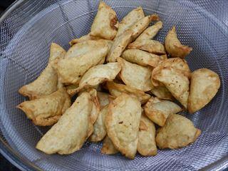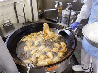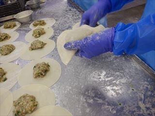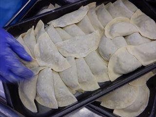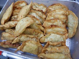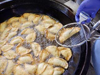餃子はひとつずつ丁寧に包み、油で揚げています。