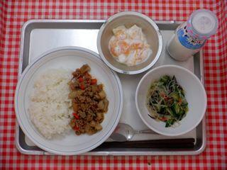 今日は、今年度のひのっ子シェフコンテストで『栄養士・給食調理員が選んだ特別賞』を受賞した【トマトとれんこんの彩りガパオライス】です。(アレルギーの関係で、【れんこんのアジアン風ライス】に料理名を変更して提供しています。)日野第一小学校の児童が応募してくれたものです。シャキシャキ食感のれんこんとトマトの旨味が感じられる料理です。ナンプラーを使ったので、アジアン風の香りとコクがプラスされ、ごはんが進む味付けです。