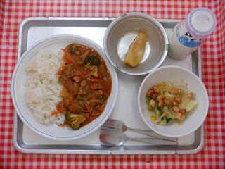 たっぷり野菜のハヤシライス・カリカリ大豆サラダ・焼きりんご・牛乳