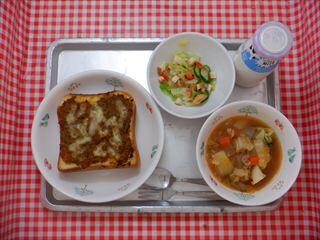 チーズカレートースト・クルトン入りサラダ・冬野菜のグヤーシュ・牛乳