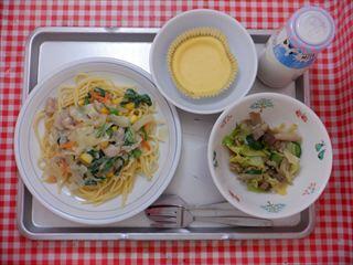 のらぼう菜のクリームスパゲッティ・森のきのこサラダ・チーズケーキ・牛乳