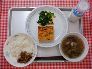 ごはん・カリカリじゃこのふりかけ・卵の唐草焼き・小松菜とコーンのレモン醤油・沢煮碗・牛乳