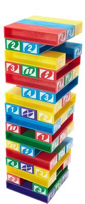 このゲームは「ウノ」と「ジェンガ」を組み合わせたゲームで、ウノのルールに従ってピースを抜いていくものです。自分が抜くピースを自由に選べないもどかしさと闘いながらの活動になります。