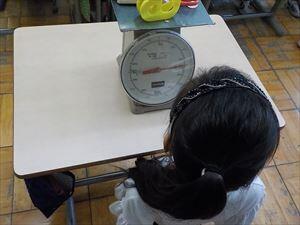 校長室前にある、頭と同じくらいのボールの重さを確かめに、様々な学年の児童が体験しに来ていました。