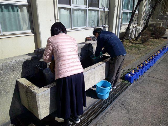 避難訓練終了後、上履きのまま避難した児童は、校舎に入る前にぞうきんで上履きをきれいにします。