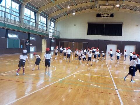 先生の鳴らす太鼓のリズムに合わせて、歩いたり、スキップしたり、走ったり、止まったりと、リズム遊びを楽しみました。