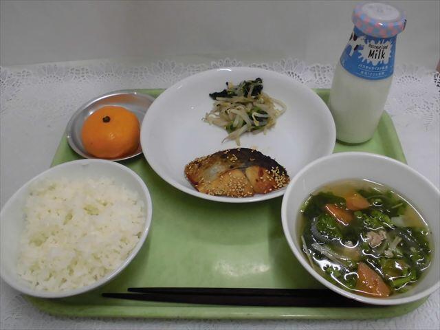 ご飯 鰆の胡麻味噌焼き もやしと小松菜の辛子醬油 菜の花のすまし汁 みかん 牛乳