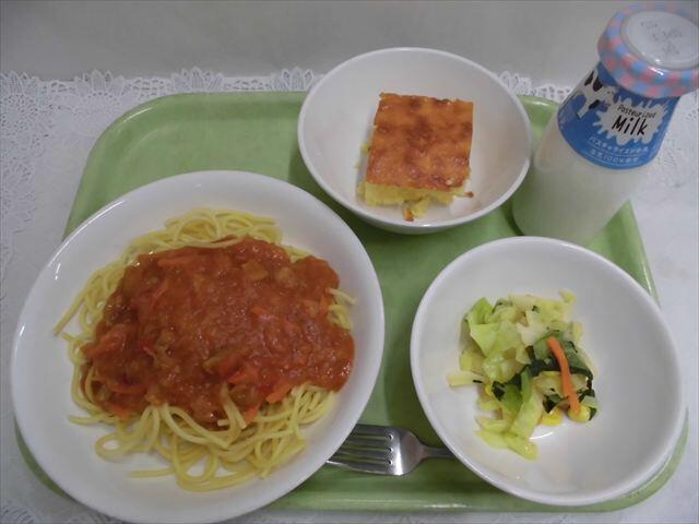 スパゲッティアラビアータ きゃべつと小松菜のサラダ クランベリーサワーケーキ 牛乳