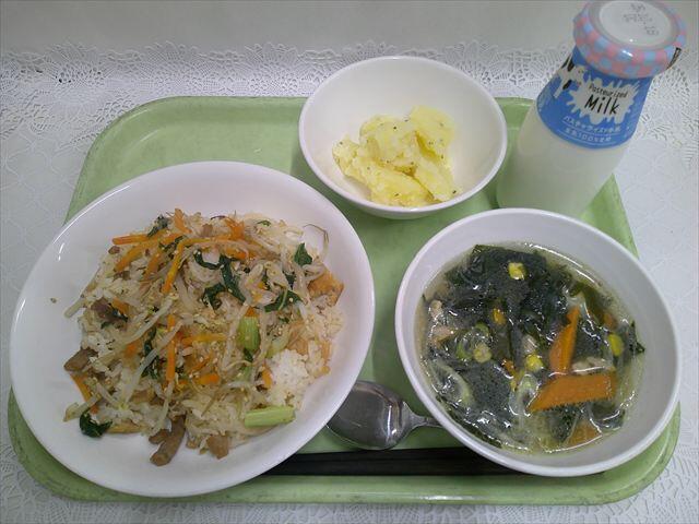 ミックスビビンバ バジリコポテト 中華スープ 牛乳