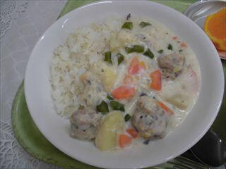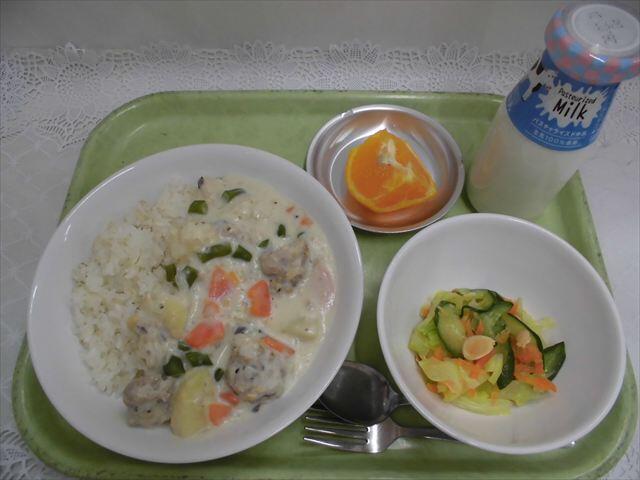 シャキシャキ肉団子のシチューごはん ナッツサラダ オレンジ(はるみ) 牛乳