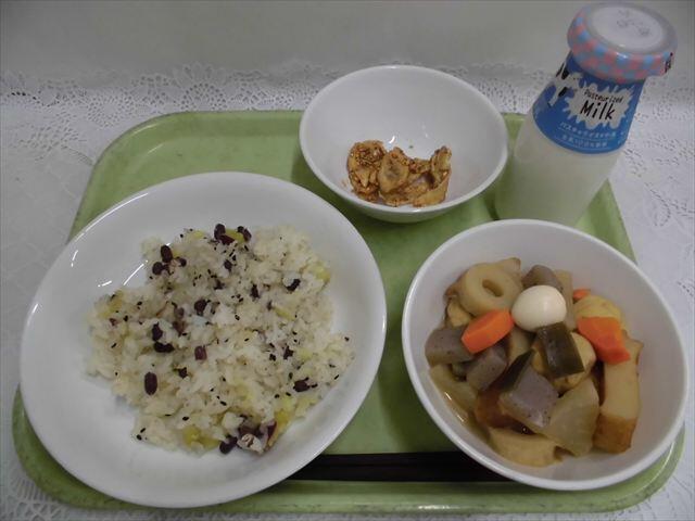 さつま芋と小豆のおこわ 揚げごぼう 東光寺大根のおでん 牛乳