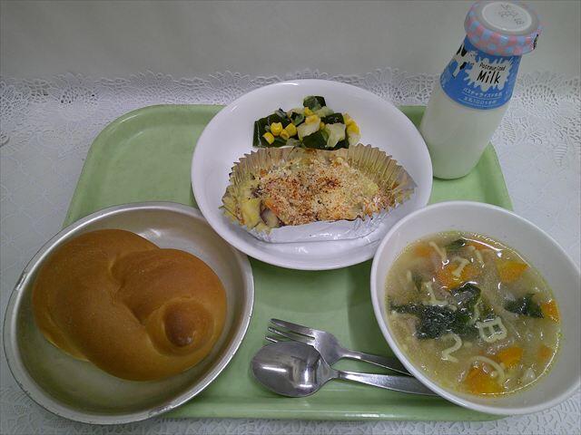 ミルクパン さつまいものグラタン わかめサラダ ABCスープ 牛乳