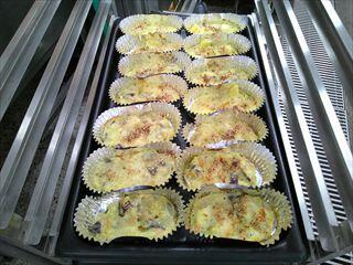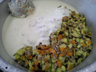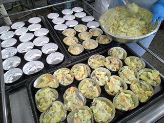 バター・小麦粉・牛乳でベシャメルソースを作り、さつまいもなどの具材を炒めたところに混ぜ合わせてカップに入れていきます。