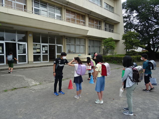 今日から9月10日(金)までの期間で分散登校が始まりました。今日はAグループの登校日でした。登校してきた子供たちは、それぞれの昇降口の前に間隔をあけて並びます。チャイムとともに検温を始めて、教室に入っていくというのがこの分散登校のスタートです。どの列のどの学年の子供たちも、静かに並んでいて、とても感心しました。6年生の教室では、Bグループの子供達が昨日クロムブックで作成した、Aグループのみんなへのメッセージを読んでいました。同じ場所にいなくても、心が通いあう瞬間でした。
