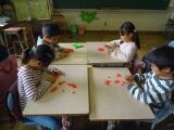おはじきを使った学習では、友達と問題を出し合い、かけ算の意味を理解することができました。