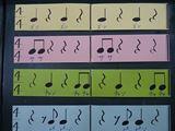 4種類のリズムカード、3種類の和音、12種類の旋律カードを使って、グループで相談しながら16小節の曲をつくりました。