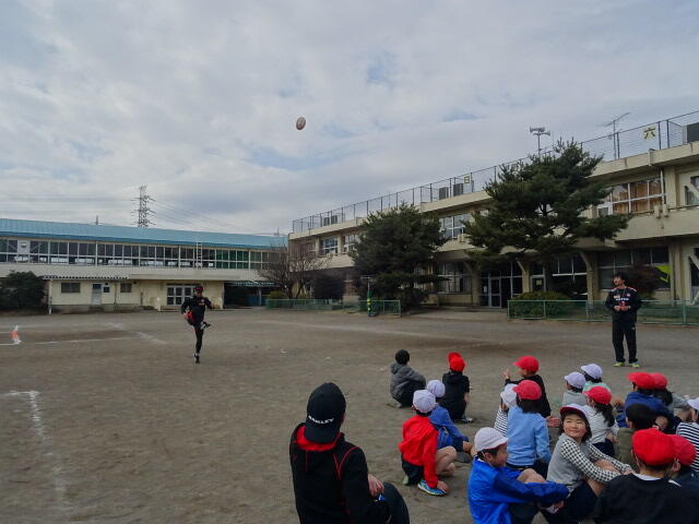 13日に日野自動車ラグビー部「レッドドルフィンズ」の選手をお招きして、タグラグビー教室を行いました。タグを使った運動を選手の方と一緒に行い、楽しく活動することができました。授業の最後にはタックルやキックを見せていただき、プロの技術を間近で見ることができ、子供たちは感動していました。