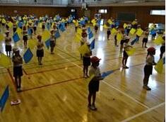 2年生は来週の運動会本番に向けて、旗の練習を毎日頑張って取り組んでいます。踊る場所の移動や、旗を大きく見せる動きなど、だんだんとみんなの動きがそろってきて、綺麗な演技になってきました。残り一週間みんなで力を合わせて”やってみよう!