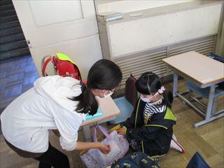 緊張している1年生に優しく声を掛けたり、体をかがめて一緒に準備をしたりするなど自分たちで考え工夫する姿が見られました。