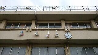 学校の色々な場所を探して歩き、その場所に書いてある文字を書いて回りました。