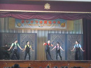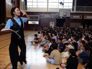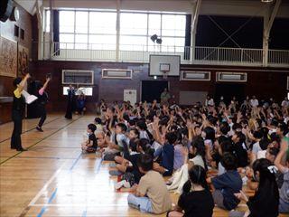 ミュージカル俳優の5人とピアノ演奏者1名による音楽劇で、子供たちとのやりとりを交えた参加型により大盛り上がりで楽しいひと時を過ごすことができました。最後に「あいさつは魔法の力」を全員で歌いましたが、その声の大きさに「こんな学校はない!」と驚いていました。