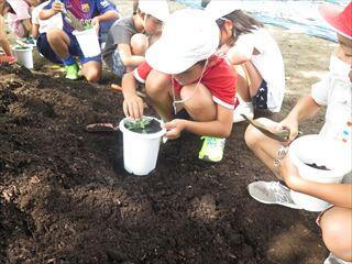 鉢ずつ苗の植え付け作業を行いました。「菊の苗つまり、赤ちゃんだよ」と紹介し