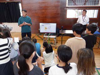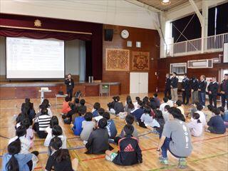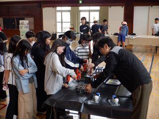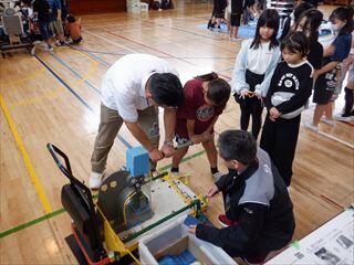 日野自動車の出前授業による「ものづくり教室」が行われました。前半に自動車の仕組みなどを教えていただいた後に、エンジンやバンパーなどのパーツを手にしたり、プレス体験、ボルト締め体験などを行いました。