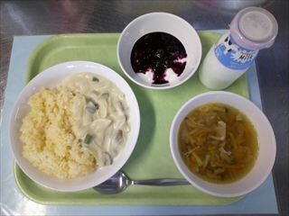 キャロットライスのホワイトソースかけ、ジンジャースープ、ブルーベリーヨーグルト、牛乳