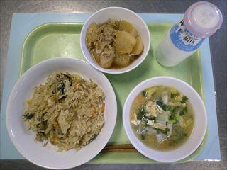 ごぼうのご飯、大根のべっこう煮、日野産野菜のみそ汁、牛乳
