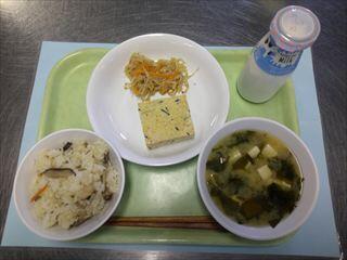 きのこ入りおこわ、五目卵焼き、ごま酢和え、豆腐のみそ汁、牛乳