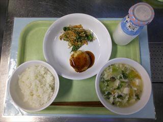 ご飯、おから入りつくね焼き、ごま和え、青梗菜のスープ、牛乳