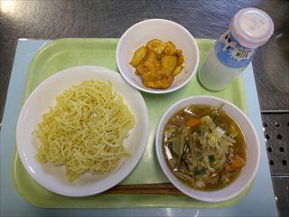 サンマーメン、生揚げとポテトのチリソース、牛乳