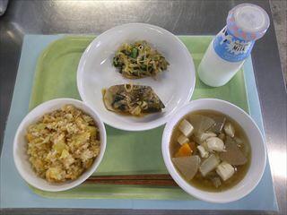 紅葉ごはん、鯖の味噌煮、小松菜ともやしの辛子醤油、けんちん汁、牛乳
