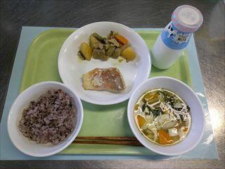 黒米おこわ、赤魚の塩麹焼き、筑前煮、かきたま汁、牛乳
