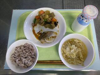 古代のお赤飯、白身魚の薬味あんかけ、筑前煮、もやしのみそ汁、牛乳