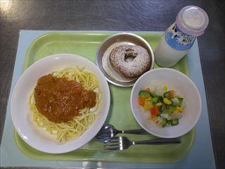 スパゲティーアラビアータ、コロコロサラダ、かぼちゃドーナッツ、牛乳