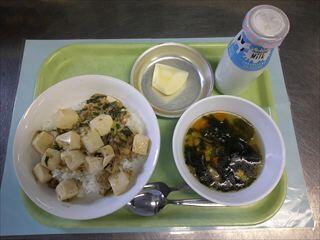 五目マーボー丼、わかめコーンスープ、りんご、牛乳