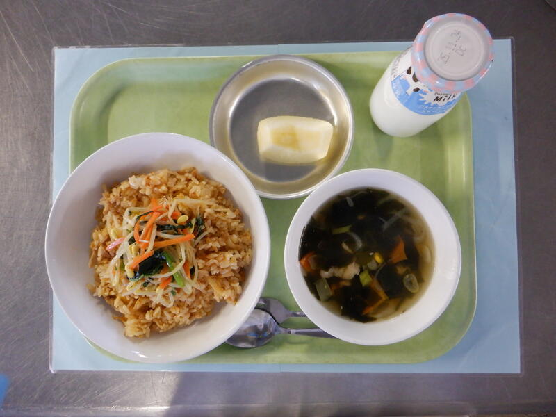 豚キムチビビンバ、わかめコーンスープ、りんご、牛乳