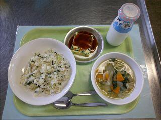 青菜のガーリックライス、洋風卵焼き、ABCスープ、牛乳