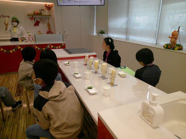 5種類のマヨネーズを試食しています。(子供たちの人気No.1は『キューピーハーフ』でした。)