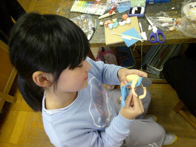 野球ボールを浮かせるために針金を使ったり、洋服の部分をフェルトでつくったり、バスケットゴールのネットに本物のネットを使ったりと、一人一人が今まで扱ったことのある材料でどのように表現するかを考え、工夫しながら制作をしています。