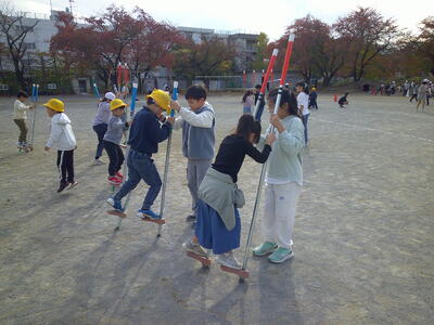 竹馬遊びでは、すすんで下級生の補助をしている様子も見られ、高学年として成長を重ねているようでした。