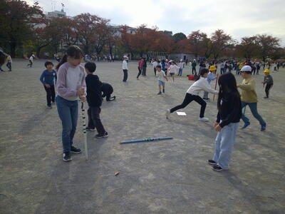 棒遊びでは、ペアの人と棒を落とさずに足元に描いた円を行き来したり、棒を落とさずにリレーをしたり、みんなで楽しめる工夫がとても良かったです。