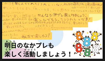 次回も子供たちの楽しそうな姿と、積極的に異学年交流をする姿が見られることに期待しています。